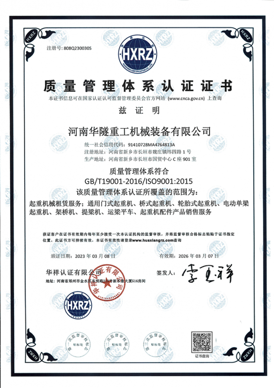 河南華隧重工機(jī)械裝備有限公司主要從事通用門式起重機(jī)、橋式起重機(jī)、電動(dòng)單梁起重機(jī),輪胎式起重機(jī)、架橋機(jī)、提梁機(jī)、遠(yuǎn)梁平車、鋼絲繩電動(dòng)萌蘆、卷?yè)P(yáng)機(jī)、起重配件制造、銷售:起重機(jī)械租賃、安裝和維修,起重設(shè)備園收,機(jī)械設(shè)備維修,鋼結(jié)構(gòu)工程承包,橋梁工程及技術(shù)咨淘服務(wù),銷售五金制品、機(jī)電設(shè)備:建設(shè)工程監(jiān)理,建設(shè)工程設(shè)計(jì),各類工程建設(shè)活動(dòng),建筑勞務(wù)分包,建筑物折除作業(yè),施工作業(yè),工程管理服務(wù),土石方工程施工,裝如發(fā)運(yùn)。  公司已通過(guò)IS0國(guó)際質(zhì)量、環(huán)境、健康與安全三合一標(biāo)準(zhǔn)認(rèn)證,特種設(shè)備制造許可證和特種設(shè)備安裝改造維修許可證。擁有完熟的質(zhì)量管理體系。嚴(yán)格的管理制度,強(qiáng)大的生產(chǎn)能力和先進(jìn)的檢測(cè)手段,在保證產(chǎn)品質(zhì)量的同時(shí),也具備了極強(qiáng)的市場(chǎng)競(jìng)爭(zhēng)力。  公司堅(jiān)持科技創(chuàng)新為理念,產(chǎn)品質(zhì)量為核心,注重信譽(yù),建立了減信可靠、快捷、思速。便利周到的售后服務(wù)網(wǎng)絡(luò)。  我們擁有的技術(shù)專家和技術(shù)服務(wù)隊(duì)伍為客戶提供充善的售前技術(shù)支持和全天候的售后服務(wù)體系,讓您無(wú)后顧之憂,享受一站式的超值服務(wù)。  “華隧重工,伴您成功“是華隧重工永遠(yuǎn)的宗指,真被的希望與各界朋友攜手并進(jìn)。共創(chuàng)輝準(zhǔn)!
